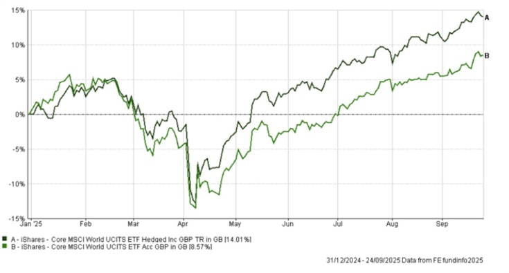 The hedged version of broad global equities in sterling has delivered a meaningfully higher return than the unhedged version. For instance, the MSCI World GBP-hedged version has returned around 14% year-to-date, compared to about 9% unhedged.